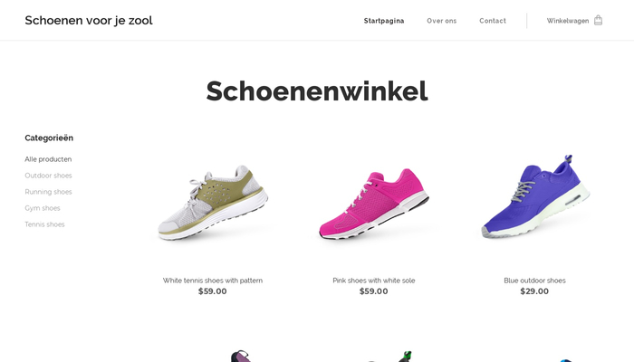 Laat de klanten van je online schoenenwinkel shoppen met onze gloednieuwe sjabloon. Plaats je producten in categorieën, voeg beschrijvingen toe en verkoop ze binnen de kortste keren in jouw gloednieuwe online winkel.