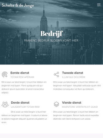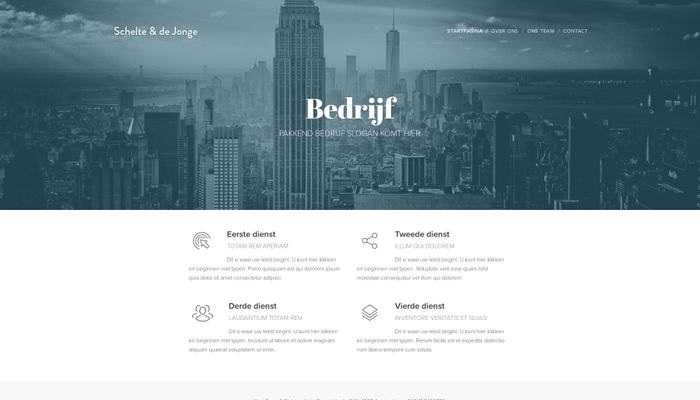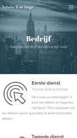 Schoon ontwerp, voorbereid voor elk bedrijf dat je online wil brengen. Presenteer je diensten op de startpagina en laat je klanten zien waarom je de beste keuze bent. Voeg meer secties precies waar je ze nodig hebt en laat je bedrijf glanzen.