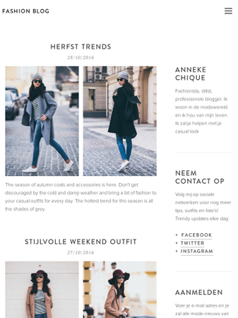 Het sjabloon voor alle fashionista's en modebloggers. Het moderne ontwerp laat alle plaatjes perfect zien. Toon de foto's van je outfits, accessoires en snapshots van een modeshow. De goed georganiseerde startpagina navigeert bezoekers gemakkelijk naar alle belangrijke onderdelen van je blog.